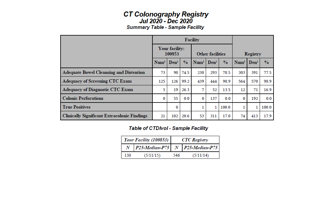 The Summary Table shows results for each CTC measure for your facility compared to the entire CTC registry in the current calendar year, and to the entire CTC registry for the previous year. Each row shows the numerator (instances), denominator (eligible for measure), and rate for each measure.