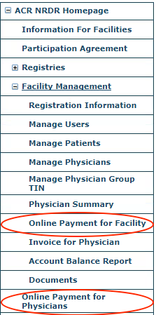 The Corporate Account Administrator is the only user able to make a credit card payment in the NRDR portal via the Online Payment link in the Corporate Account Management Financial menu.