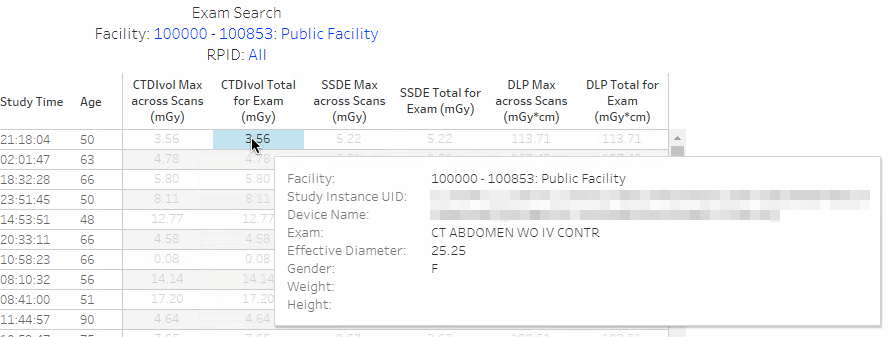 Selecting a specific exam from the scatterplot will bring up a pop-up box with exam details and highlight the exam in the Scanner Statistics table.