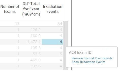 This dashboard displays all the exams corresponding to the filter selections. It helps identify and explore outlier exams and enables removing exams from the exam listing. The screenshot below shows an example of how to use the # Irridation Events filter to display only exams with 4 or more irradiation events.