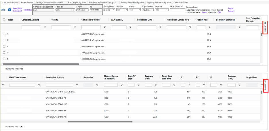 Get started by selecting a Corporate Account, a corresponding Facility, or Facilities, and a time frame of interest. The report displays two data tables. The top table displays exam-level information (e.g., performing facility, patient age, and study description). The bottom table displays event-level information (e.g., acquisition protocol, exposure techniques, and exposure index). The report can be filtered by body part, device type, view, age group, and specific DR equipment/station. The sample screenshot below shows a list of exams and events for X-ray cervical spine exams performed over a two-month period across all DR stations for adult (over 18 years) patients.