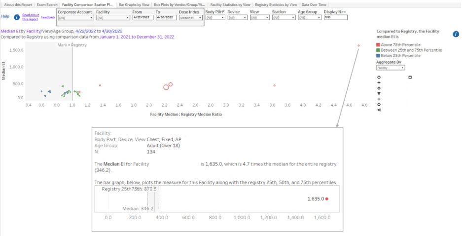 In the scatter plot (see example below), there is one mark for each combination of facility, body part, device type, view, and age group. The value on the y-axis is the facility median for that combination. The value on the x-axis is the ratio of the facility median to the registry median.