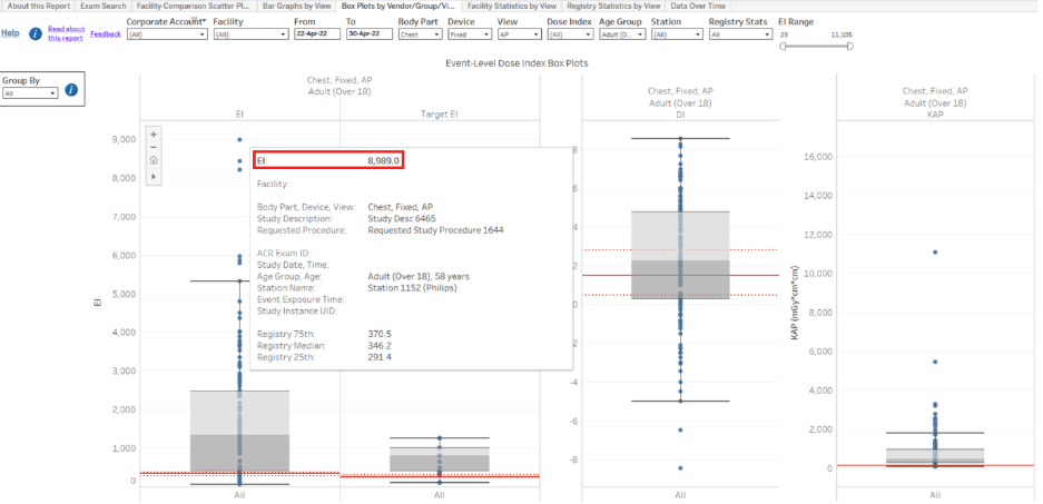 This dashboard displays box-and-whisker plots of individual event data by body part, device type, view, and age group. By reviewing event-level data, one can identify outlier cases. In the example below, a chest AP view acquired using a fixed device has an extremely large EI of nearly 9000. Using the study date/time and patient age in the information box, it would be possible to trace back to the original study in PACS to examine the root cause of the large EI. The box-and-whisker plot also provides information about data distribution. In this example, the target EI values for chest-fixed-AP expands a wide range, the reason for which should be understood.