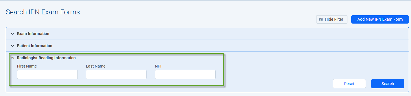 Functionality has now been added to filter IPN exams by Reading Radiologist first name, last name and NPI number in the IPN Exam Form.